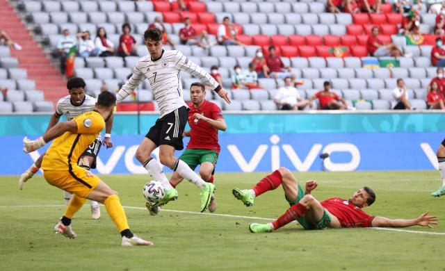 欧冠决赛,多少对本场的胜负产生了一定的影响。哈弗茨、韦尔纳和吕迪格在欧冠赢了鲁本·迪亚斯和贝尔纳多·席尔瓦。坎塞洛在欧冠决赛未能上场,因为新冠阳性,欧洲杯开打前又被达洛特取代。哈弗茨的理论位置并不是箭头,韦尔纳在欧冠决赛为哈弗茨拉出了空当,同理,格纳布里的作用也是如此。哈弗茨对德国的头三个进球都有贡献,迫使迪亚斯乌龙;接应穆勒二次传中造成葡萄牙门前混乱;最后把握戈森斯传中,打开了代表德国在大赛的进球账户。德国从之前可能出局的阴影中走了出来,不仅出线希望大增,甚至可能取代法国头名出线。